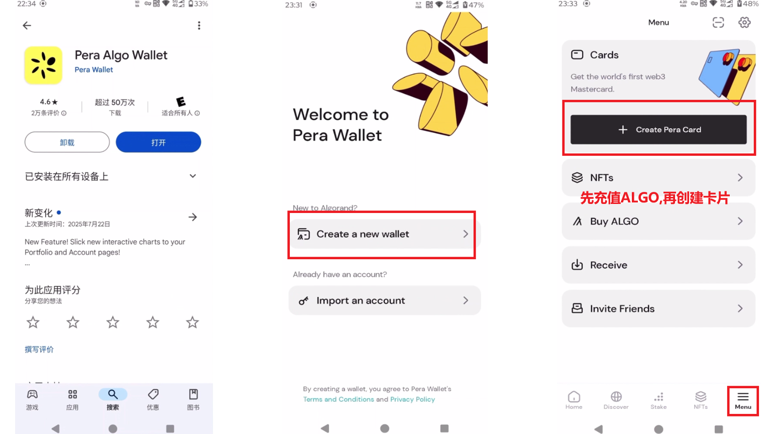 谷歌或苹果商城下载钱包,打开 APP,创建钱包( 提示: 创建钱包后,及时备份助记词 ),充值几个 ALGO,授权时需要 ALGO 作为燃料费,找到 menu,点击“create Pera Card”。
